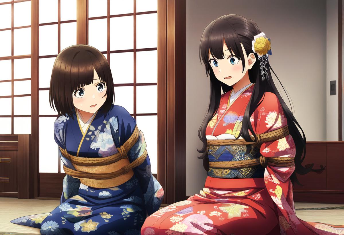 铃木莉娜蜷缩着膝盖,试图在束缚中寻找一丝可怜的舒适。她身着的藏青色和服,原本素雅沉静,其上手工刺绣的紫阳花图案更是雅致,此刻却被纵横交错的麻绳压得皱巴巴,