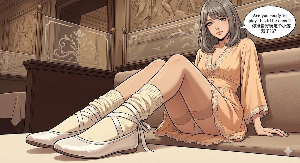 下半身的裙摆则是和服中飘逸感的现代延伸,层层薄纱和蕾丝的轻盈材质使得每个步伐都如同在云端行走,裙角的浮世绘图案既保留了和服的文化底蕴,又增添了一份难以言喻的性感。透过轻薄的纱质,隐约可以看见她的肌肤与细腻的线条,仿佛一种悄然的邀请,让人无法移开目光。她的腿部搭配更显精致——超薄透明肉色丝袜下是光滑无瑕的肤色,脚踝上是日式可爱堆堆袜,将一种“少女感”与“可爱装扮”有意延续至脚踝以下。她脚踩一双白色缎面芭蕾风的小皮鞋,鞋面简洁却充满优雅,脚背上缠绕着柔软的丝带,宛如从舞台上下来的洋娃娃,尽显温柔与精致的美感。“你准备好玩这个小游戏了吗?”此时的林祈还没意识到,接下里要发生的事情远没有小游戏这么简单。