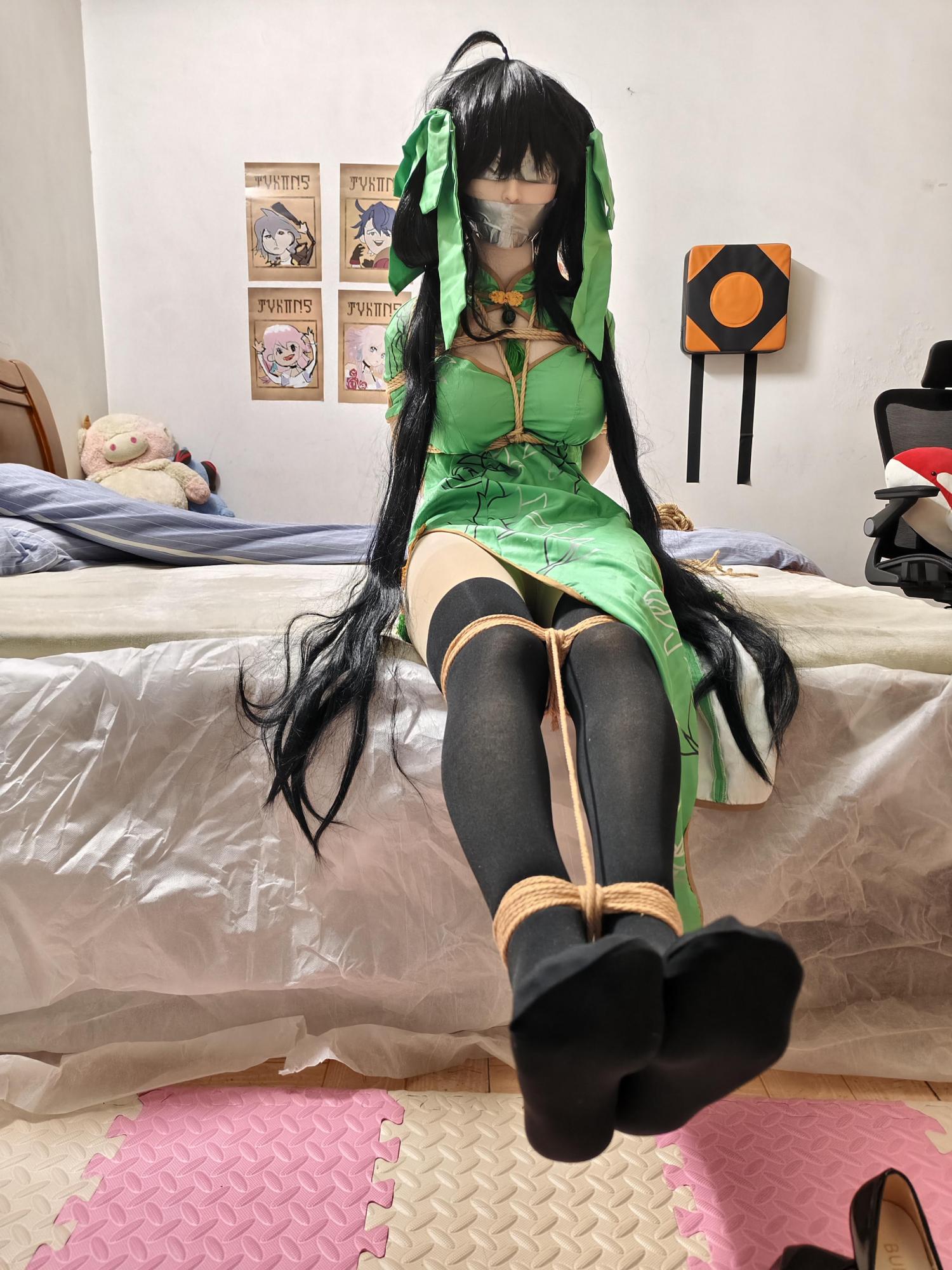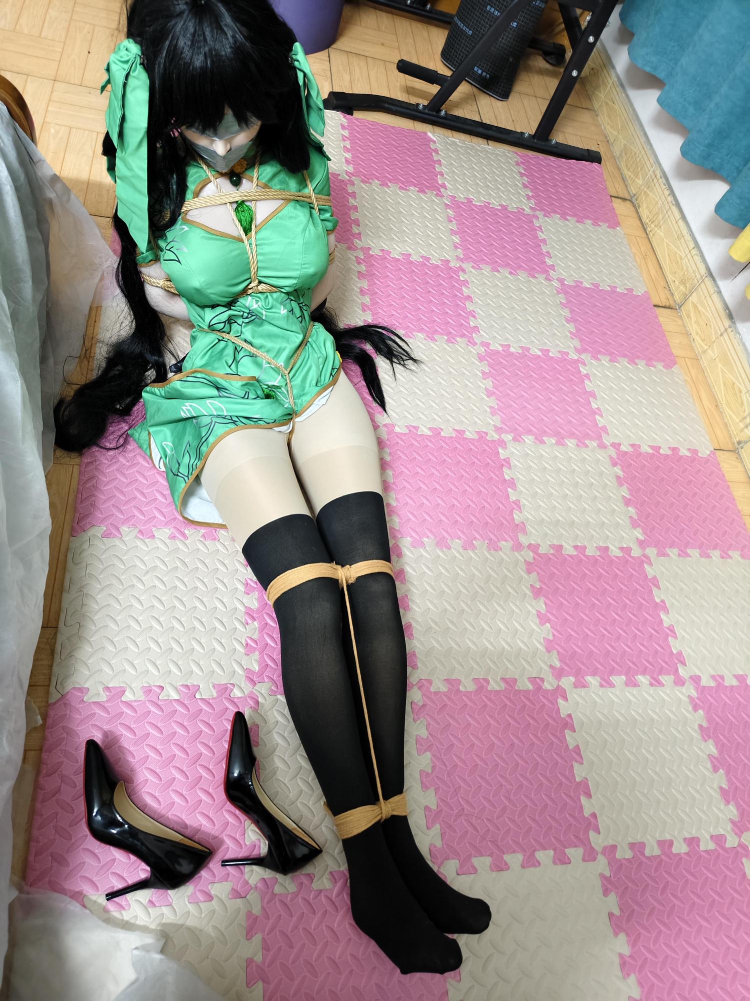 先是大腿根部,一道粗绳从旗袍开衩处钻进去,绕着双腿缠了五六圈,勒得黑丝深深陷进大腿肉里,把两条腿死死并在一起。