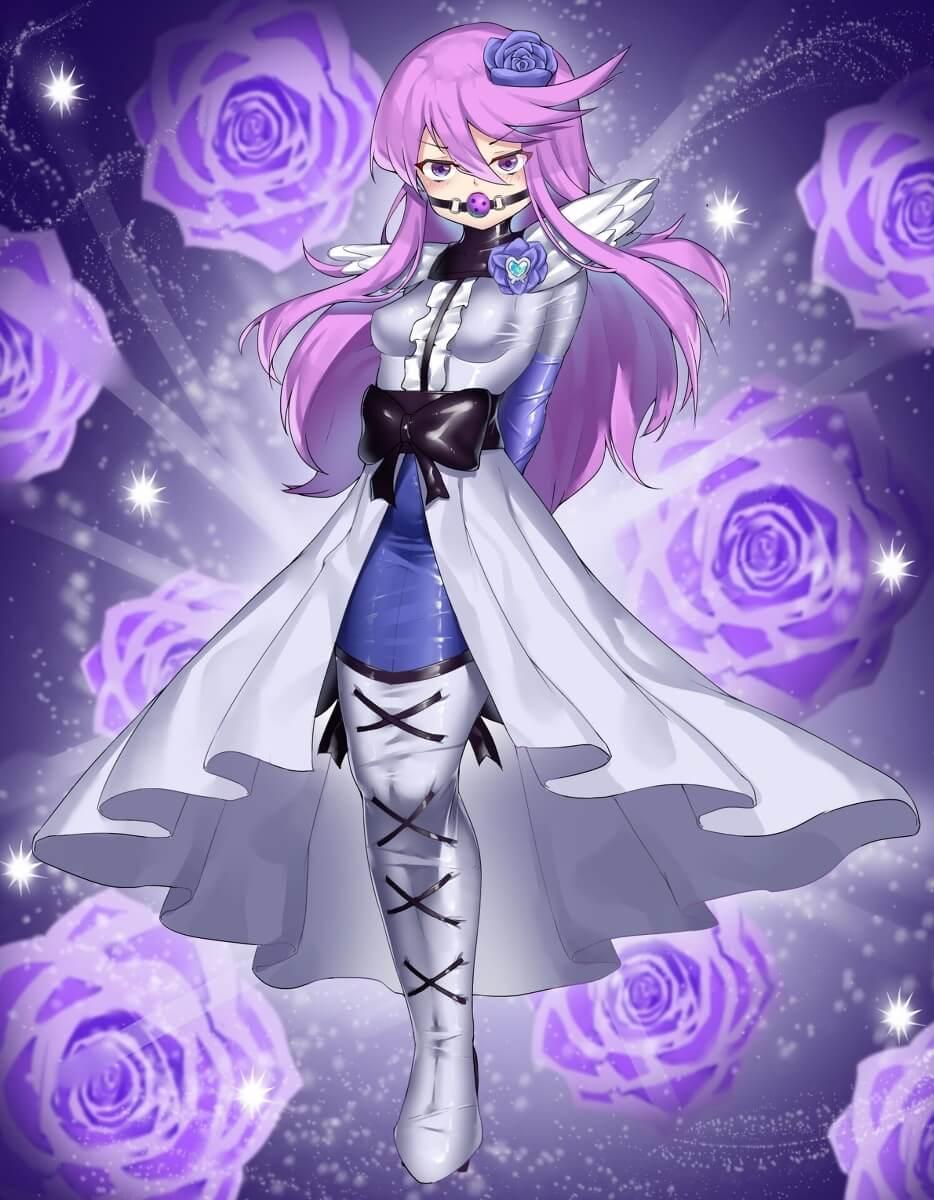 双腿挤在类似单筒靴的连衣裙下半部分,外侧有黑色皮带加固,底部有类似高跟鞋的又细又长的鞋跟。