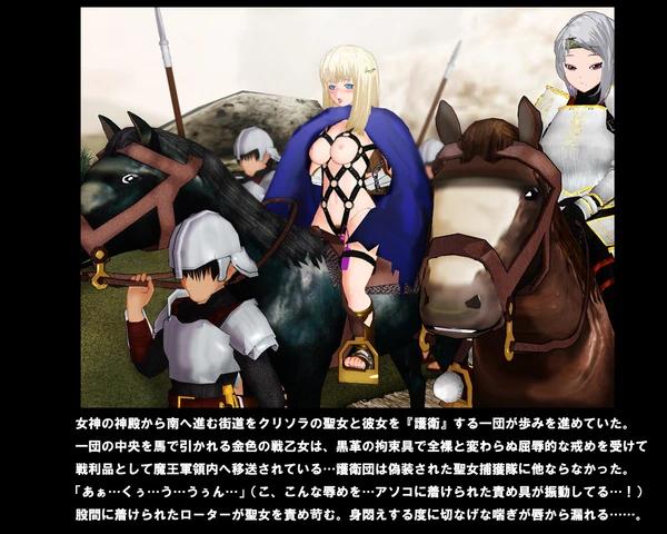 从女神神殿往南走的街道上,克里索拉的圣女和“护卫”她的队伍正在前进。队伍中央被马牵着的金色战乙女,因为黑色皮革的拘束具受到与全裸同样的屈辱的惩戒,作为战利品被移送到魔王军领地内......护卫团就是伪装的圣女捕获队。