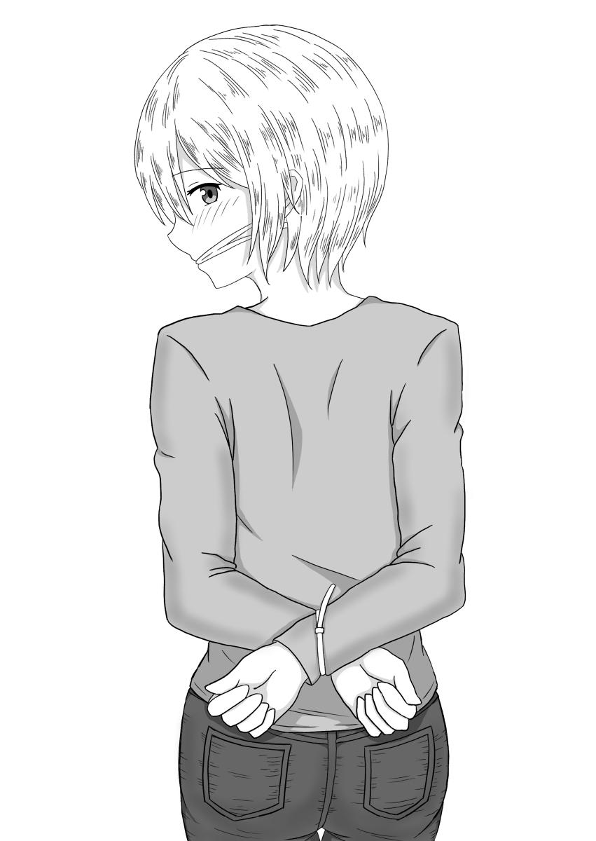 双手被束紧带绑在后手,脚踝也同样被勒紧。嘴里塞满了脱脂棉,从上面用细长的像蜂蜜一样的布,用力地把猴子塞进嘴角。