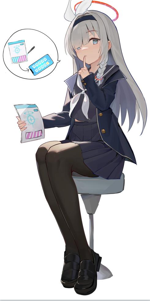 柔顺的银色发.丝披肩垂落,发梢搭在腰间,修剪整齐的刘海微微遮住右眼,漆黑的发圈箍.住头发,可爱的白色蝴蝶结发饰坐落在右侧鬓角,下面长长的银色的发.丝被编织成了一条可爱的麻花辫,辫子尽头系着一根玫红色的小小发圈,随着她的步伐前后摇摆。