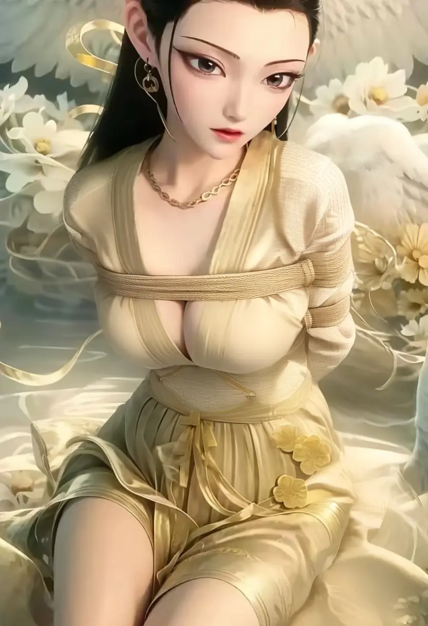 绳索仍在收紧,霎时,鹤童的身体猛地一颤,金光从她额前的羽毛印记中迸发,伴随着一声清鸣,她的仙人之躯再也支撑不住,化作原形——一只白羽仙鹤。她的双翅被绳索死死缠住,羽毛散落几片,细长的鹤颈被勒得微微弯曲,眼中满是震惊与羞愤。