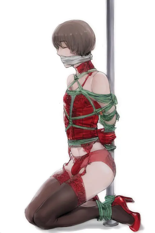 紧接着,她又将目光投向我的双腿。她用力分开我裹着白丝的双腿,然后把我的大小腿合拢,用绳子一圈一圈地紧紧捆住。