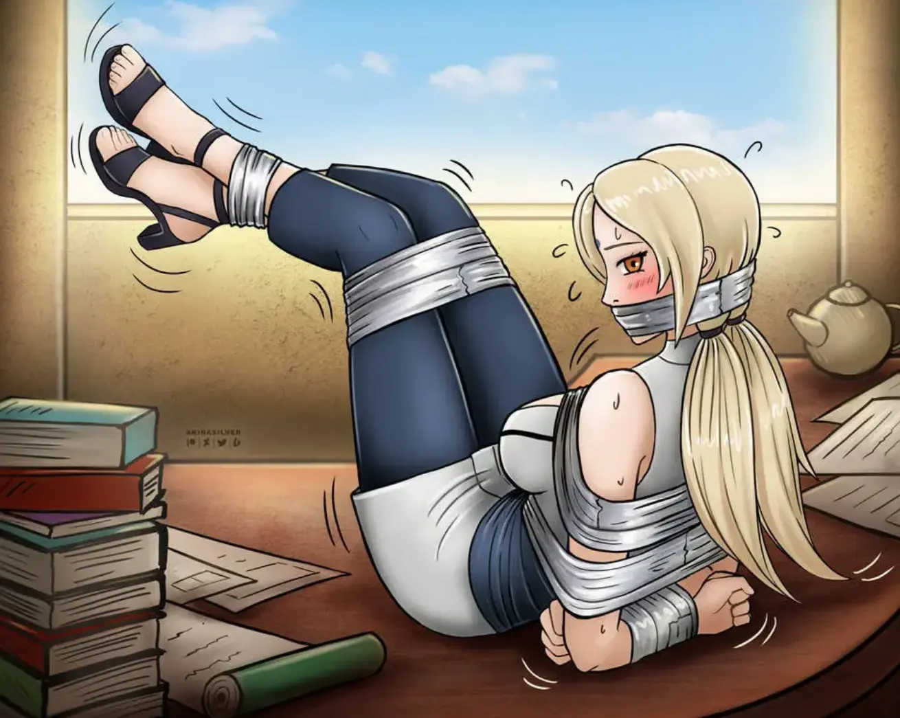 许琪的上半身仅剩一件被绳索压迫得变形的黑色蕾丝内衣,原本精致的花纹因束缚而扭曲成一块块阴影,显得格外刺目。在灯光的映照下,她的身体上泛起一层冷汗,与赤裸的下身形成鲜明对比。她的头发凌乱地散落在肩膀上,几缕碎发贴在额头上,显得狼狈不堪。尽管身处如此困境,许琪的眼神中依然透露出一丝倔强和不甘,仿佛在无声地抗议着这一切的不公。其中一位......