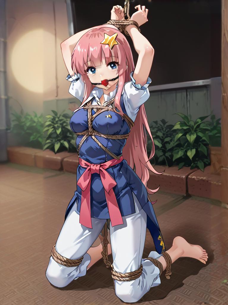 反绑在背后的手腕早已被麻绳磨得麻木,交叉缠绕的三圈绳结随着她呼吸的起伏,一下一下碾过腕骨处破损的皮肤,渗出来的血珠混着冷汗浸进麻绳的纤维里,留下淡淡的红痕。脊柱中段的死结扯着束腰,让四片震动贴始终严丝合缝地贴在她汗湿的腰侧,每一下震颤都顺着毛孔钻进骨头里,顺着脊椎一路往上窜,窜得她后颈的汗毛都竖了起来,头皮一阵阵发麻。