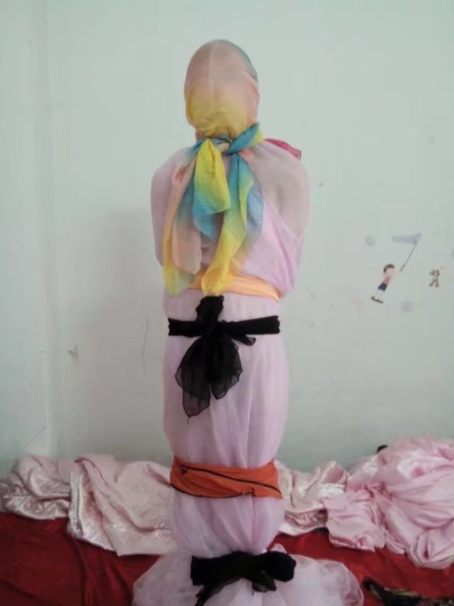 成熟性感的美少妇小笑此时已经完全被我全包束缚起来了,头部被我用一只黑色长筒渔网袜套头后,再用一块很大超薄的透明洁白无瑕的白纱巾包裹起来起来,在脖子上捆绑结实,然后再套了一层黑色的超薄长筒丝袜,而她的小嘴在套渔网袜之前就已经被一块大丝巾堵起来了,接着我把她的全身上下用长丝巾捆绑结实,用上了我的十二分力气,因为对于小笑这个少妇,一般的紧缚肯定满足不了她,所以我必须要满足她对超紧束缚的强烈要求,之后我便从她的超大皮箱里找到20双超大超薄弹性超级大的连裤肉色丝袜,对于这些丝袜,就一条的话其实是超薄超透明的那种,但是质量确实很好的,虽然比不上小可小点里......