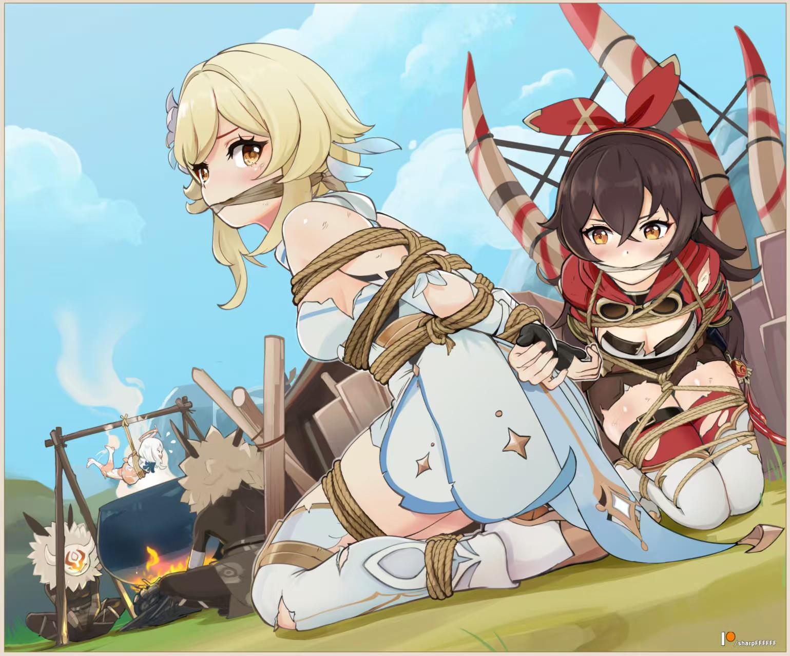 旅行者萤和安柏再=在巡逻途中被丘丘人小队俘获