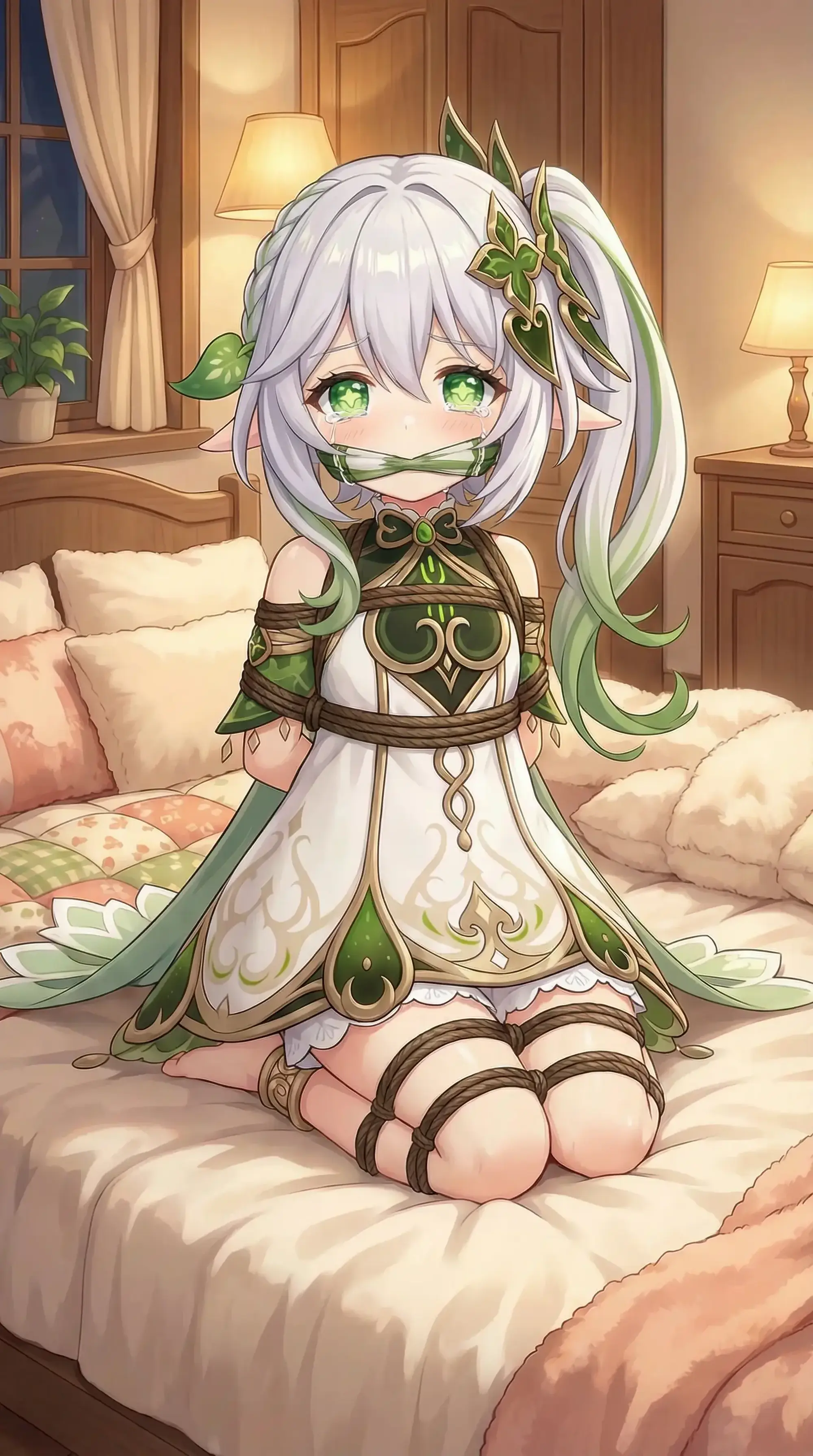 纳西妲,正是女孩的名字,只是此时的她却赤裸着身体,红色的绳索在那娇小白皙的身体上编织出了密集的绳路,菱形的绳索图案勒在她平坦的小腹和胸口,双手则被交叉着紧紧捆在背后,就连那柔软的手指都一根根被细小的丝线缠绕着捆成一团,双腿则以盘腿的姿势被缚在一起。