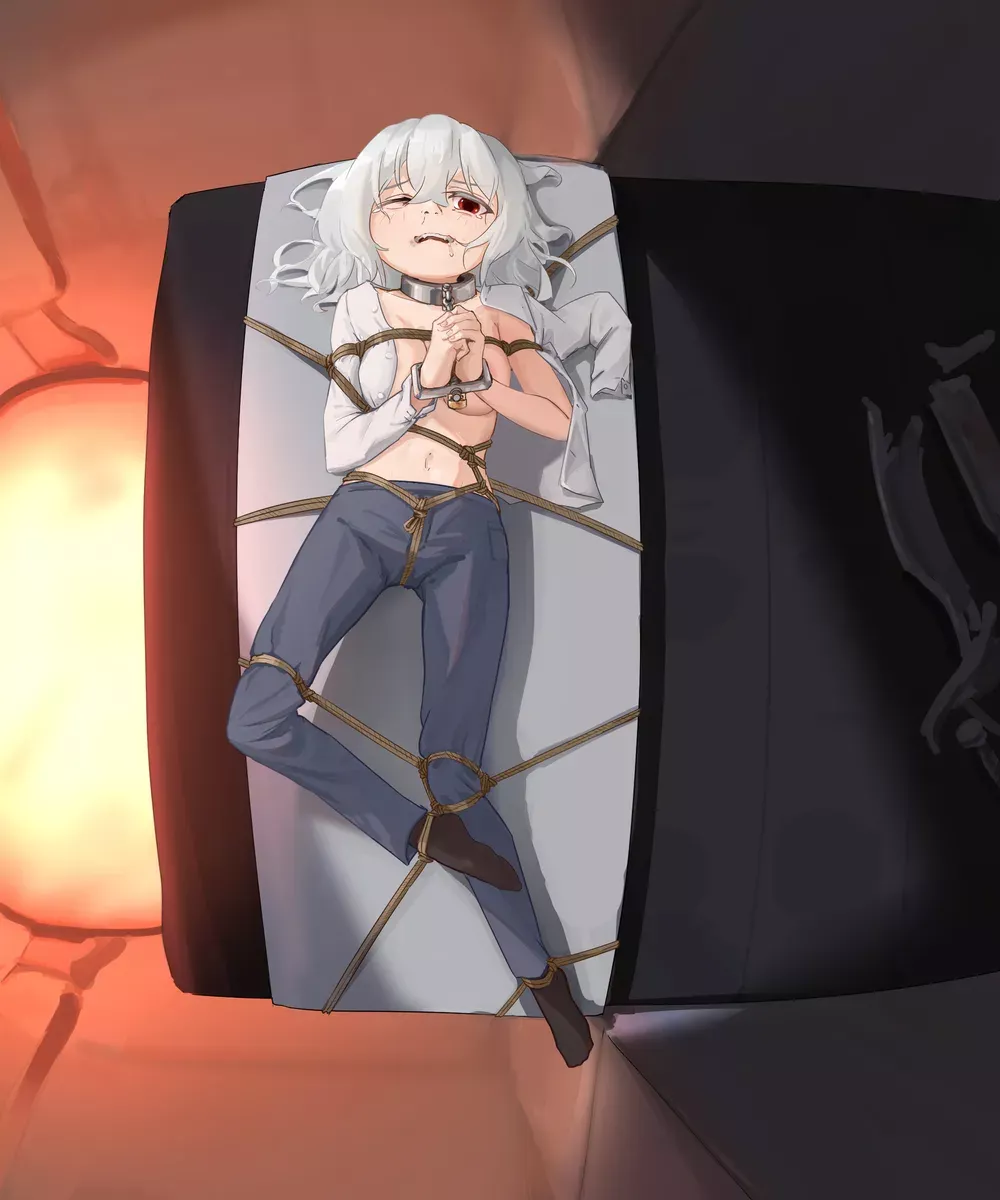 她先坐在地上,再次确认自己被束缚的情况。正如预想的那样,胸口上下缠绕着麻绳,双臂被反绑在身后固定住;脚踝和膝盖上下也都被绑着,别说跑了,连走路都困难;想呼救,可一块几乎遮住半张脸、连鼻子都盖住的布,堵住了所有声音。